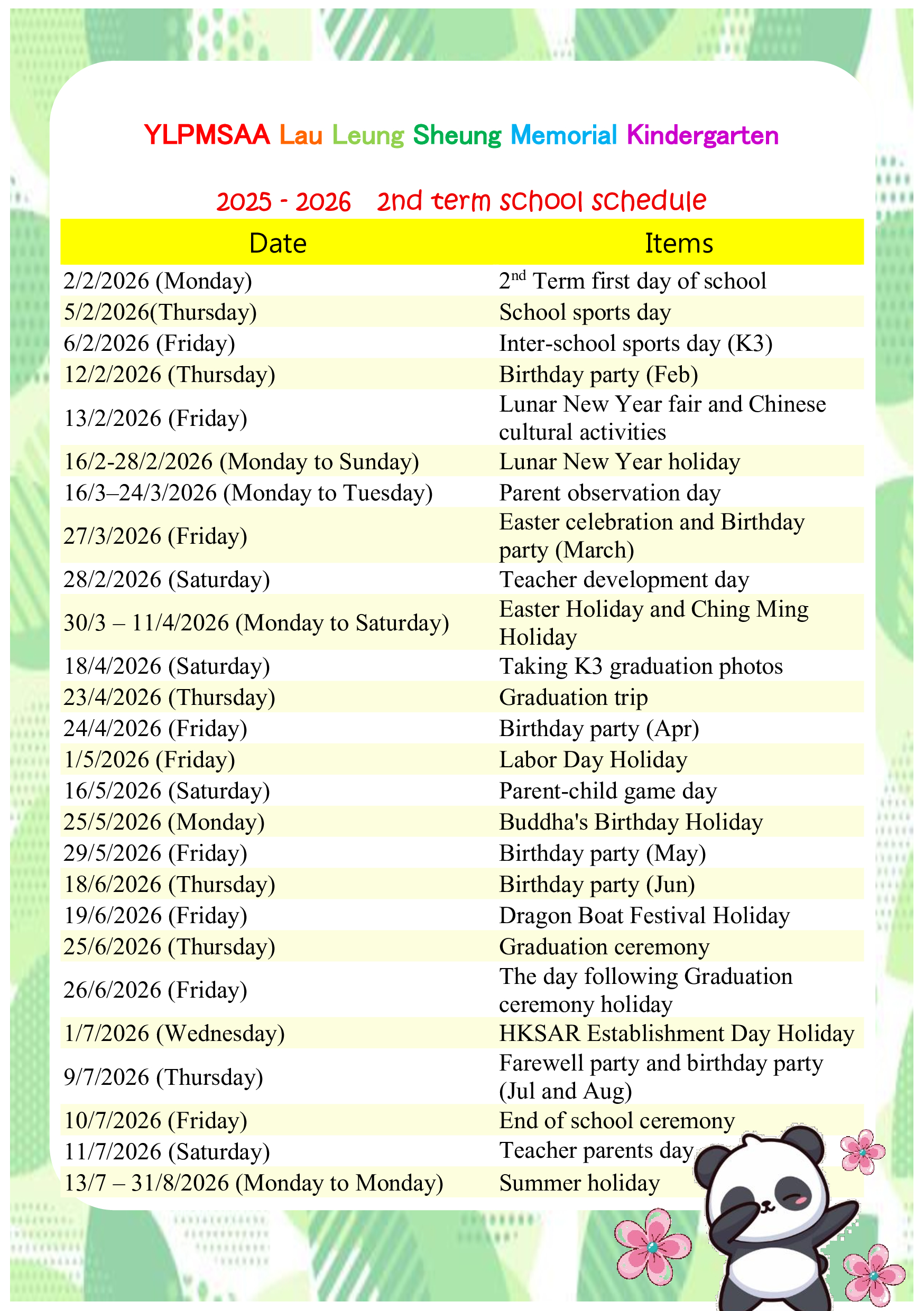 2 nd term School Calendar 2025-2026